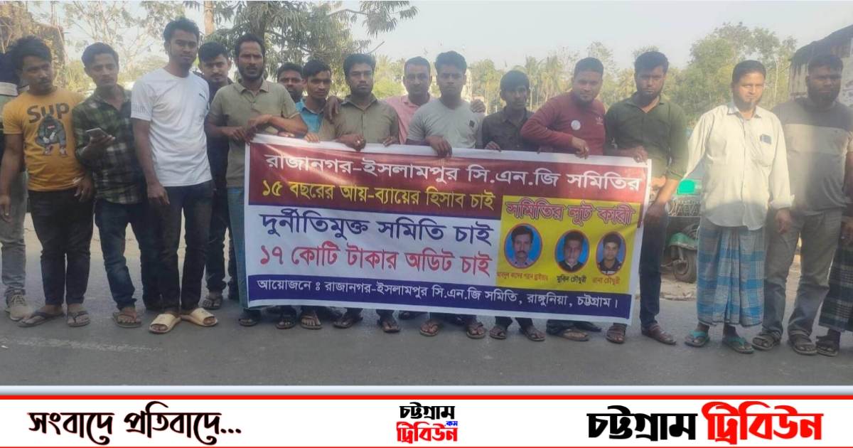 চট্টগ্রামের রাঙ্গুনিয়ায় রাজানগর-ইসলামপুর সিএনজি সমিতির ১৭ কোটি টাকা আত্মসাতের অভিযোগ এনে পিতা আব্দুল কাদের চৌধুরী পরান ছাড়াও তার দুই পুত্র রানা চৌধুরী ও মুবিন সহ পরিবারের ৩ জনের বিরুদ্ধে ব্যবস্থা গ্রহণ এবং সমিতির ১৫ বছরের অডিট চেয়ে মানববন্ধন ও স্মারকলিপি প্রদান করেছে রাজানগর-ইসলামপুর সিএনজি সমিতির চালকেরা।